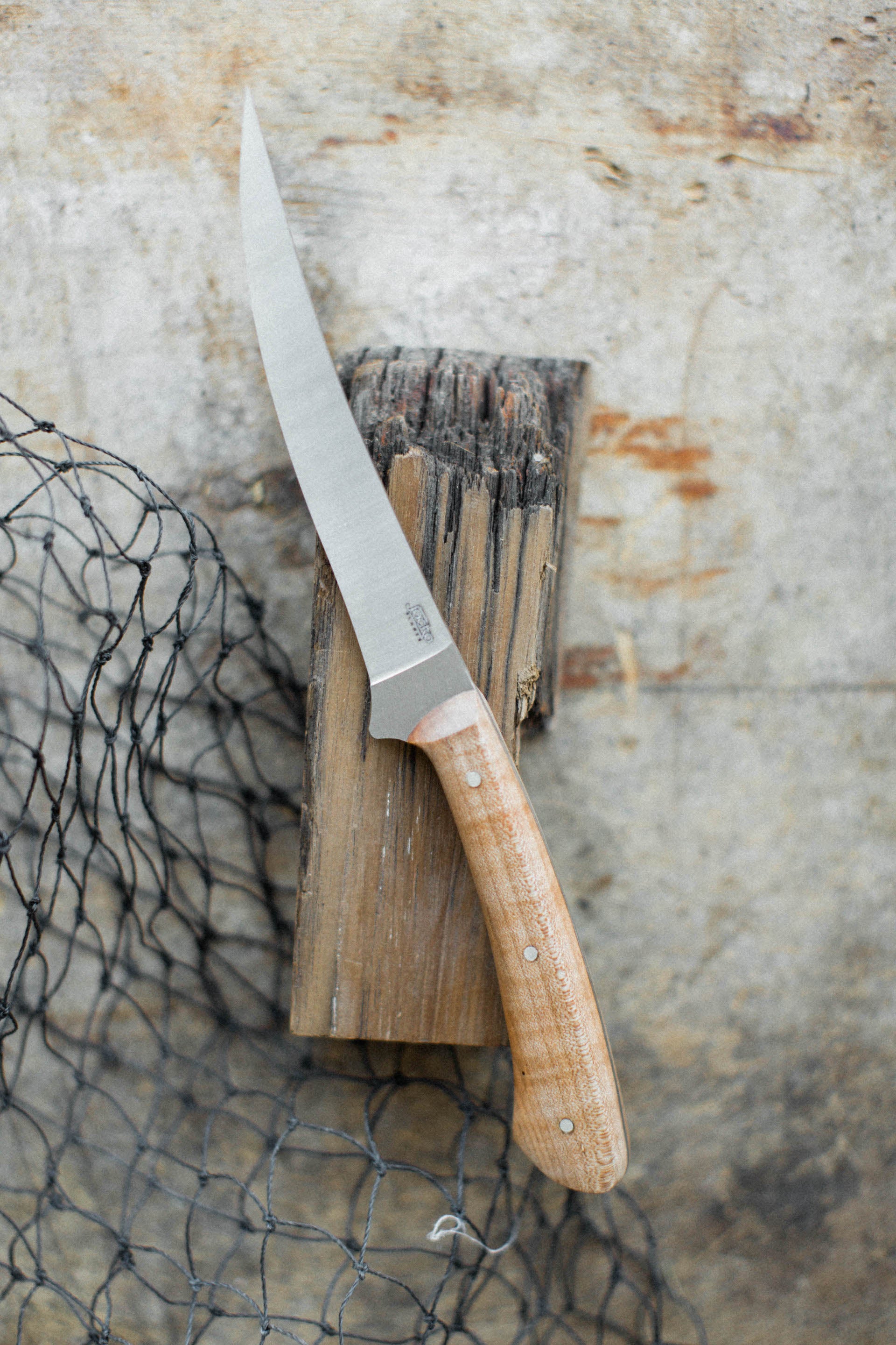 ....and he'll need a filet knife. Meet The Puppie. This gorgeous 7" stainless steel blade can handle even the biggest of fish tales. Grab one in walnut, curly maple, or just silence everyone with this one scaled in teak from the USS NC battleship.